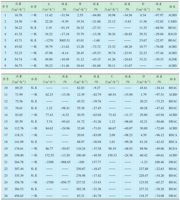 在表1中,“ - ”表示由于接收信號的差異,超聲波流量計不顯示累積流量,并且超聲波流量計累積誤差> 20%的流量表明測量誤差是由于質量差接收到的信號。對表1中的數據進行分類,以獲得一般水質和水質差的情況下4個流量計的誤差統計。表2和表3分別顯示了正常和劣質水質的流量計誤差統計。