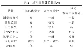 根據三種流量計的特點,從測量精度,測量范圍,壓力損失,抗干擾能力,運行維護等方面進行了比較,如表2所示。